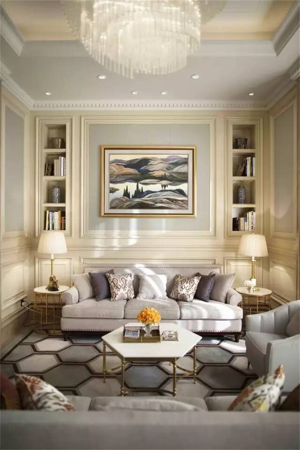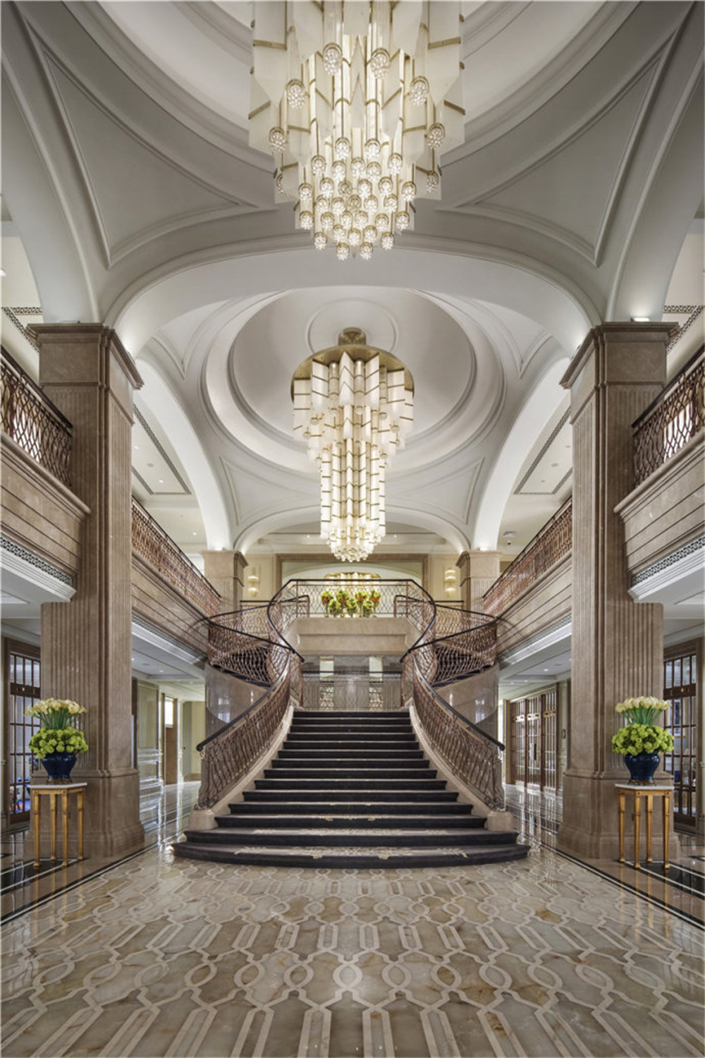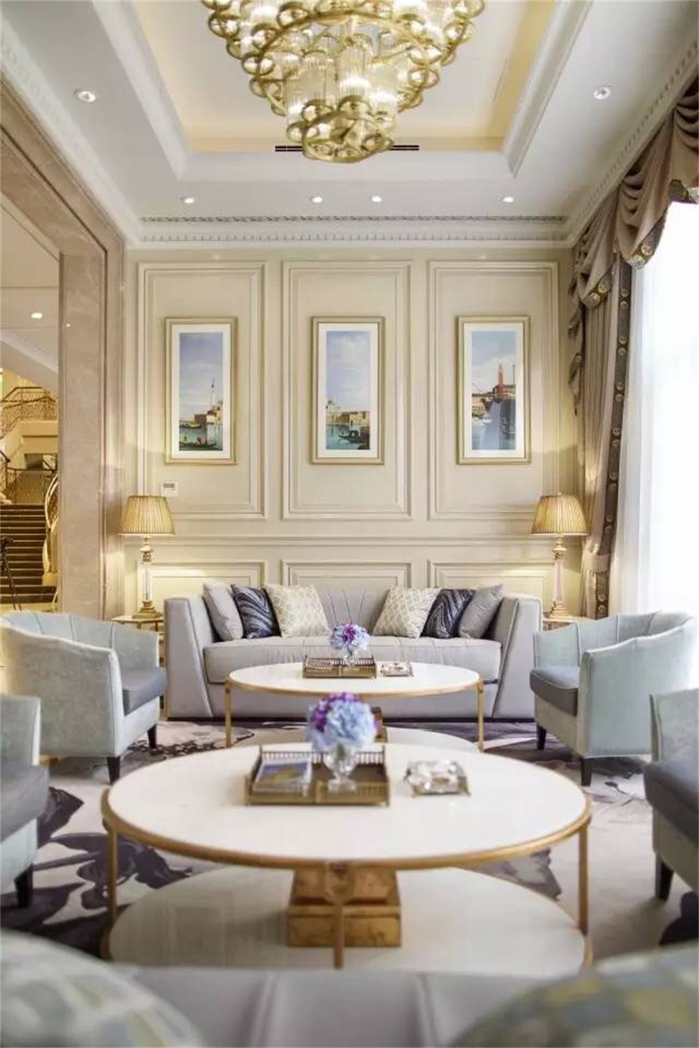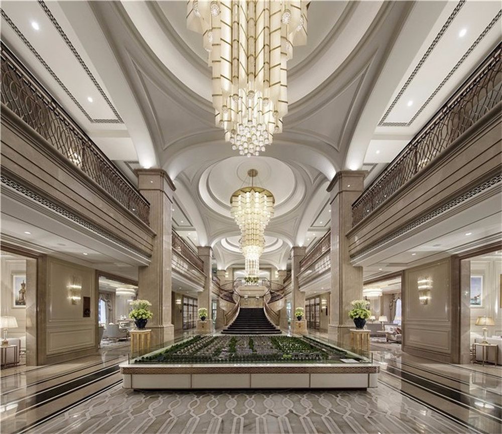 整個空間陳設注重氣質,留意精神世界。室内一共三層(céng),以中軸線對稱布局。迎賓(bīn)大廳作爲售樓處的第一空間,由一扇藝術浮雕屏風虛掩而入。拱頂、水晶吊燈與優雅的家俱陳設,凝聚法國古典與當代美藝精華。現代法式花藝與藝術飾品随處可見,與法國建築的曆史元素相輔相成,與精緻内飾通融契合。