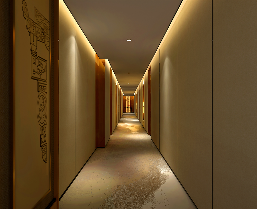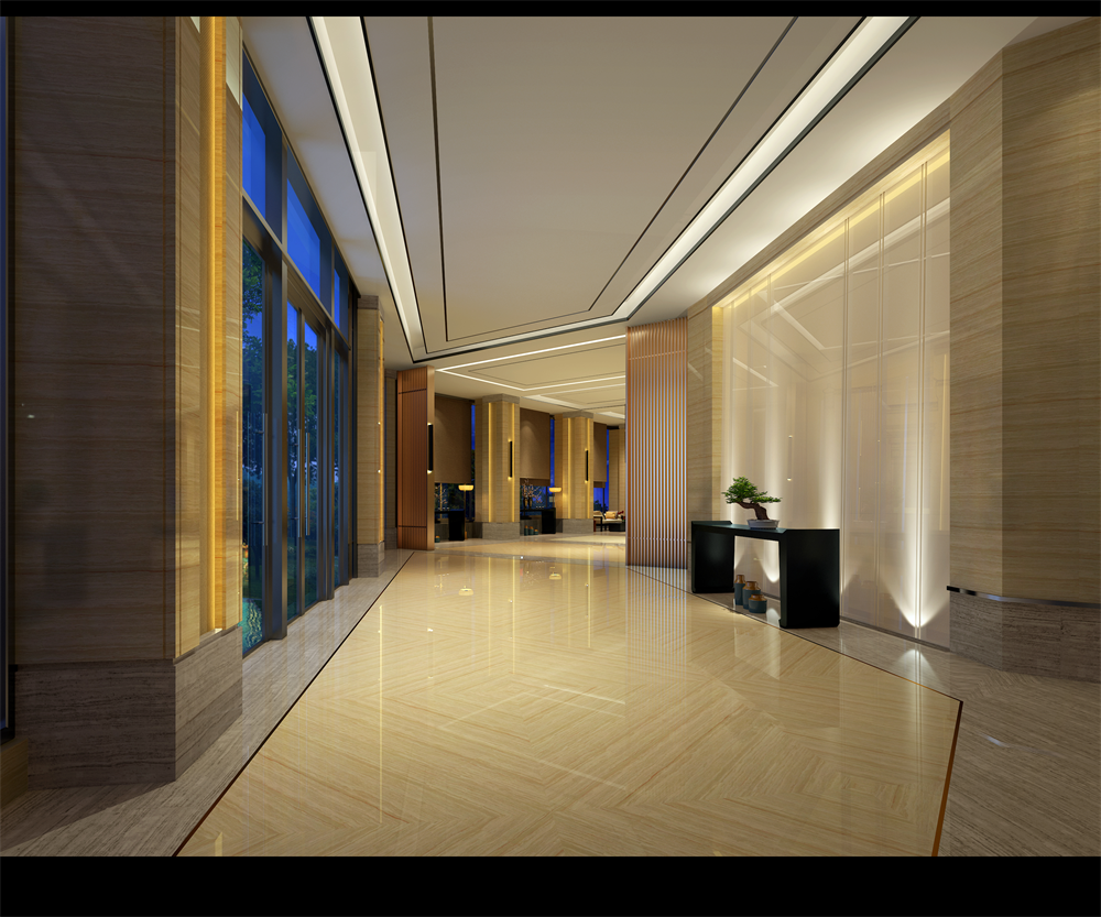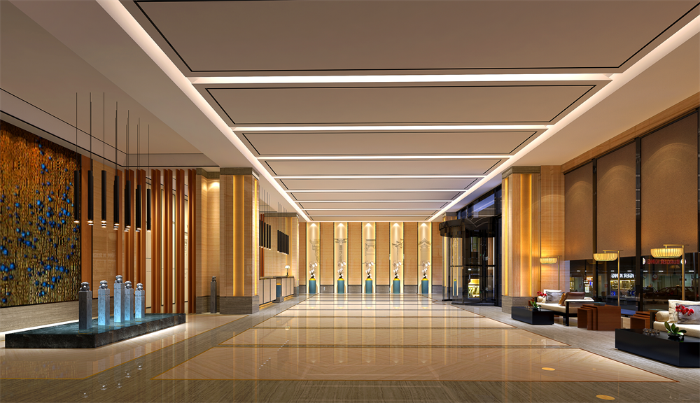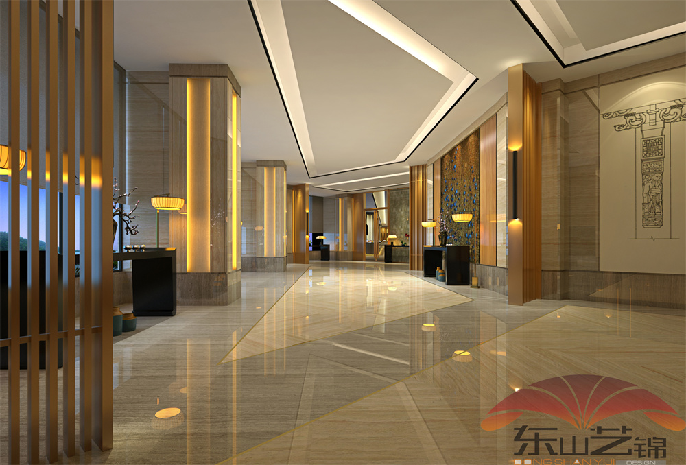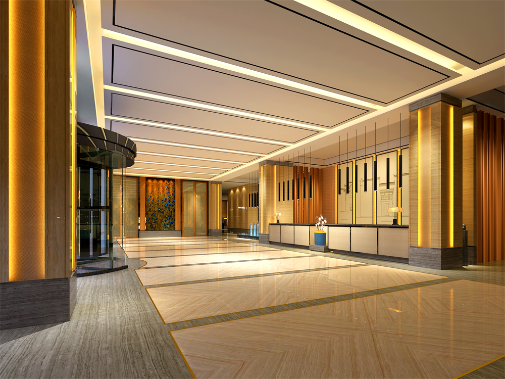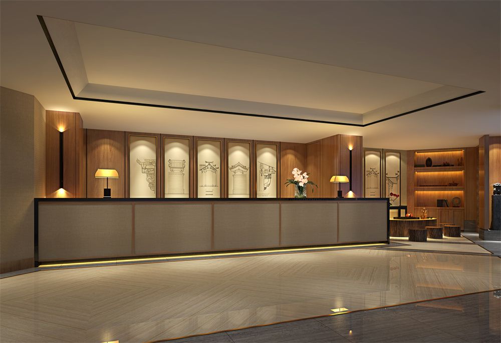 大堂是酒店的第一印象,大堂空間及内部功能分區總體十分的合理,整體空間的布局和布置本著合理利用節省空間的原則,在頂面採用瞭簡單大方的石膏面吊頂的設計,並且在牆邊和柱子上設置瞭暗藏燈帶,起到瞭很好的裝飾性和實用性。在前台牆面的設計上加入瞭中國風元素的裝飾風格,並且融入瞭線條的設計感,在簡潔中尋找其暗藏的美感,簡潔而不簡單的變化。