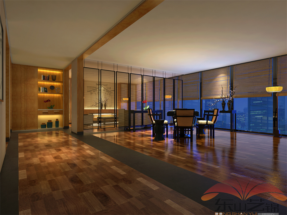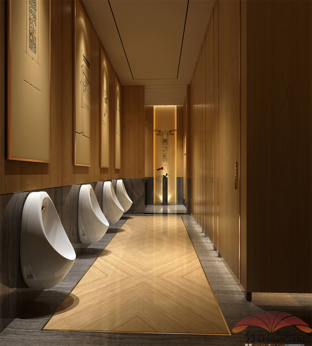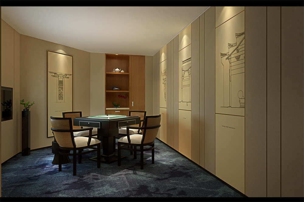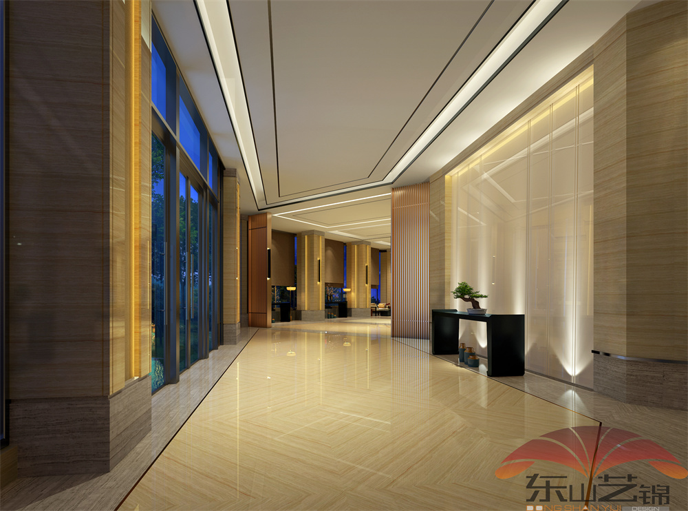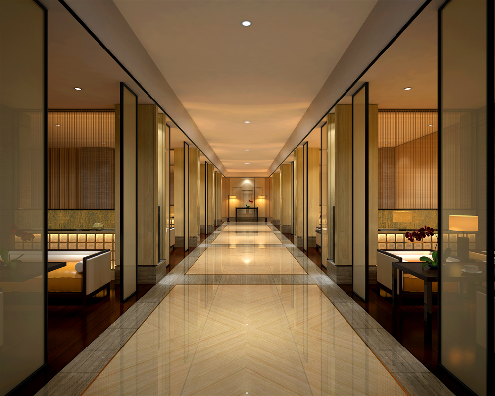 大堂是酒店的第一印象,大堂空間及内部功能分區總體十分的合理,整體空間的布局和布置本著合理利用節省空間的原則,在頂面採用瞭簡單大方的石膏面吊頂的設計,並且在牆邊和柱子上設置瞭暗藏燈帶,起到瞭很好的裝飾性和實用性。在前台牆面的設計上加入瞭中國風元素的裝飾風格,並且融入瞭線條的設計感,在簡潔中尋找其暗藏的美感,簡潔而不簡單的變化。