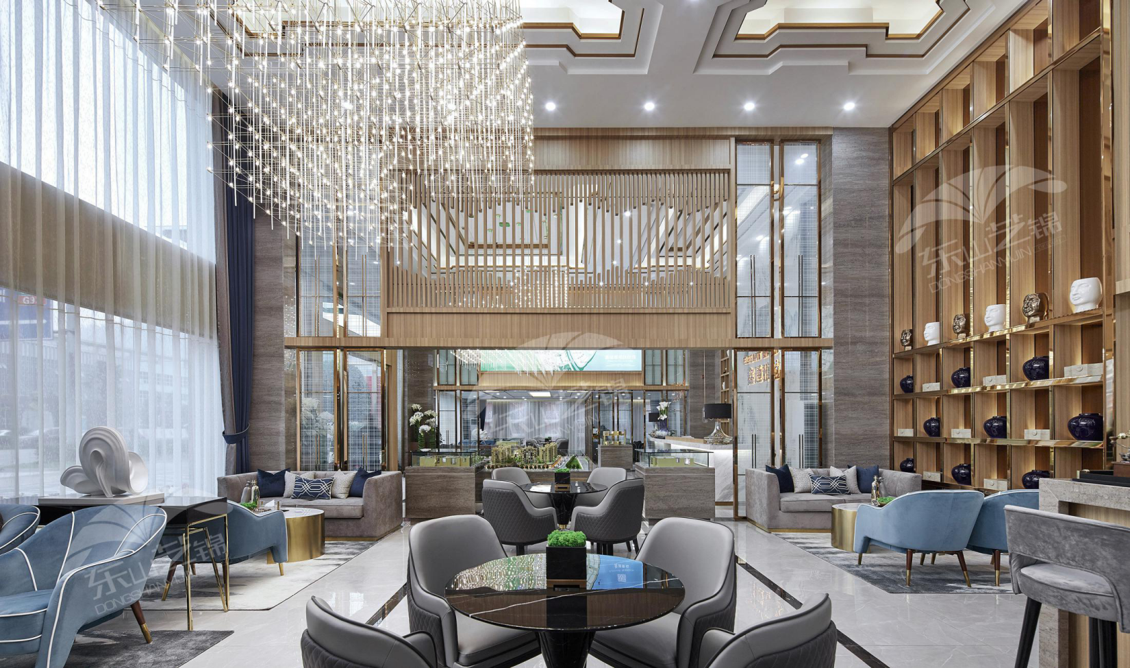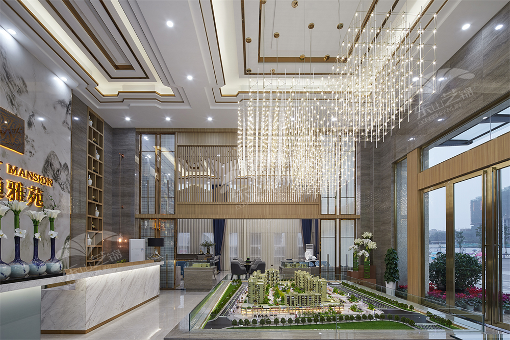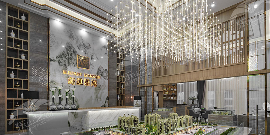 設計(jì)者在滿足銷售大廳的功能上,中間部位設計(jì)瞭(le)沙盤展示區、洽談區。二者相互共享又互不幹(gàn)涉,合理利用瞭(le)空間。沙盤展示設立在中央顯眼的位置,服務台造型簡約,利用金屬镂空設計隔擋(dǎng),簡單(dān)又不失穩重。